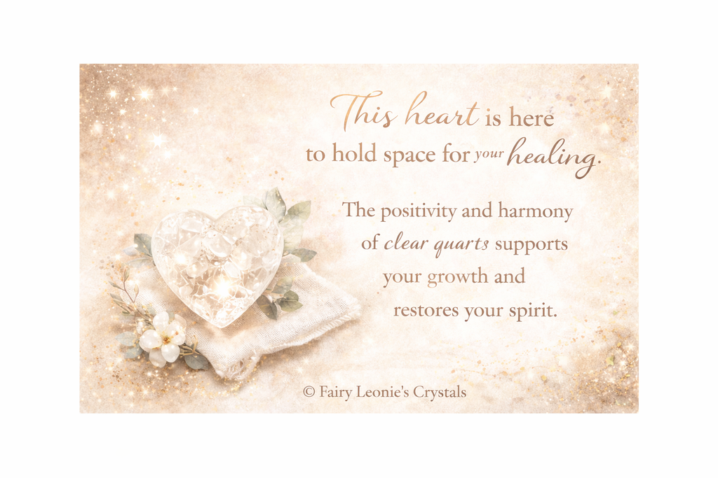 Each Sacred Heart Crystal Card has been lovingly created to accompany a heart-shaped crystal talisman. These cards offer a moment of reflection, comfort and spiritual connection — a quiet reminder that healing is held with tenderness and care.